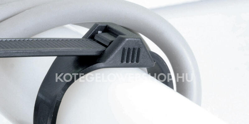 390 x 9 mm méretű, fekete színű kábelkötegelők alacsony fejprofillal, széles testtel, külső fogazással és lekerekített élekkel. Az alacsony fejprofil lekerekített élekkel csökkenti a sérülésveszélyt. A csomag 100 darabot tartalmaz.